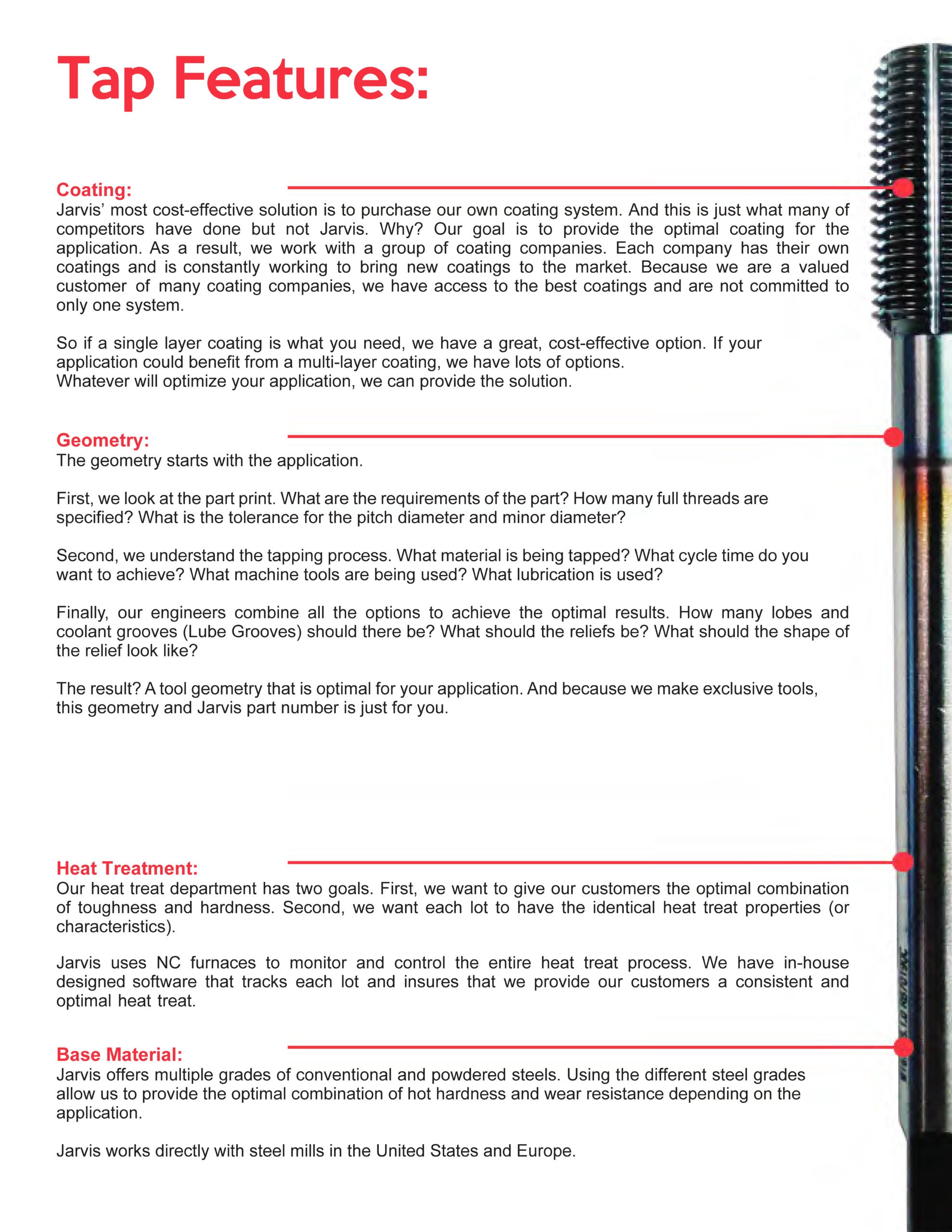 Enhance your tapping performance with Jarvis’ comprehensive range of advanced features and configurations. From premium coating options and optimized base materials to precision geometry, heat treatment processes, and coolant-through solutions.