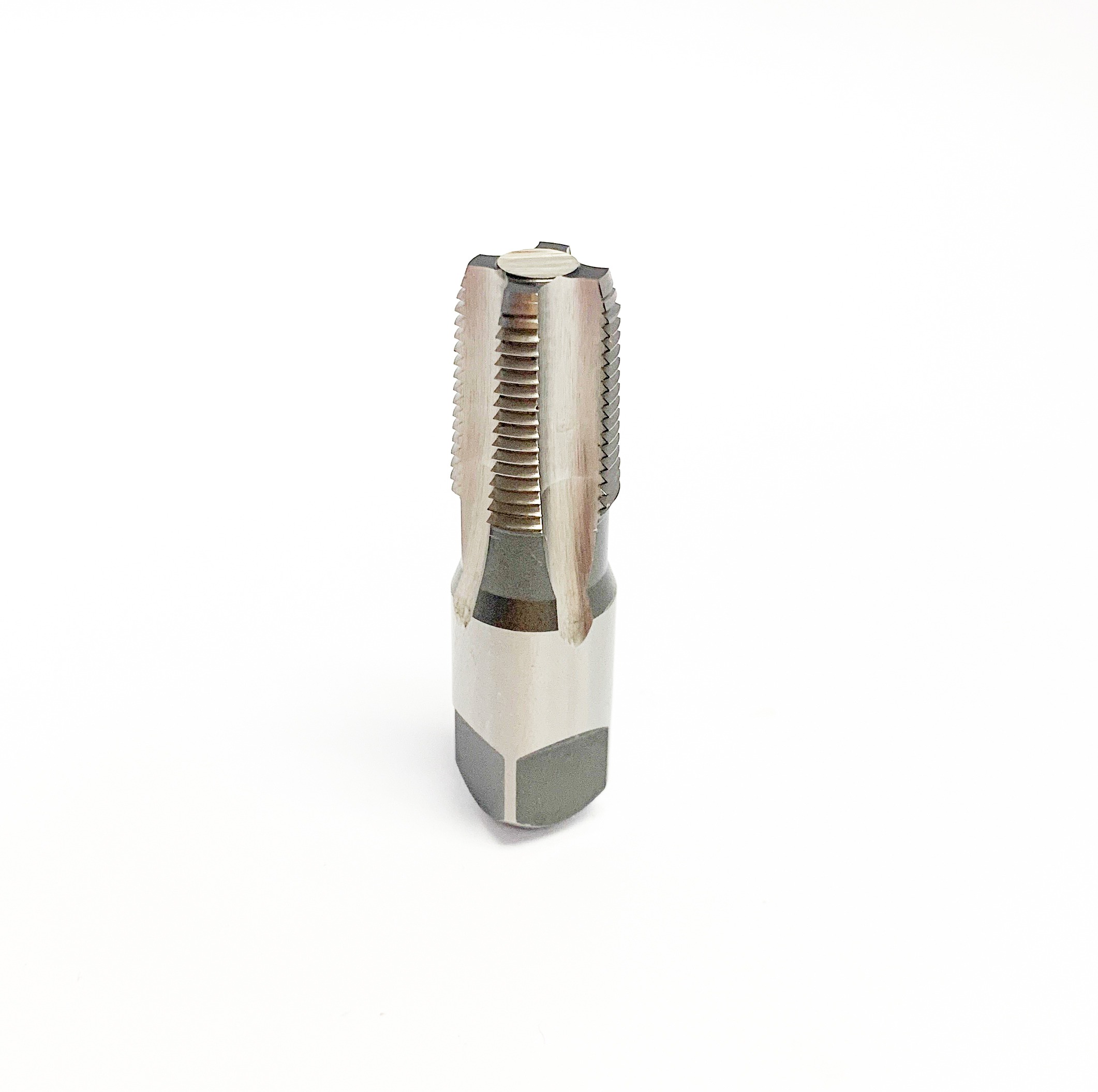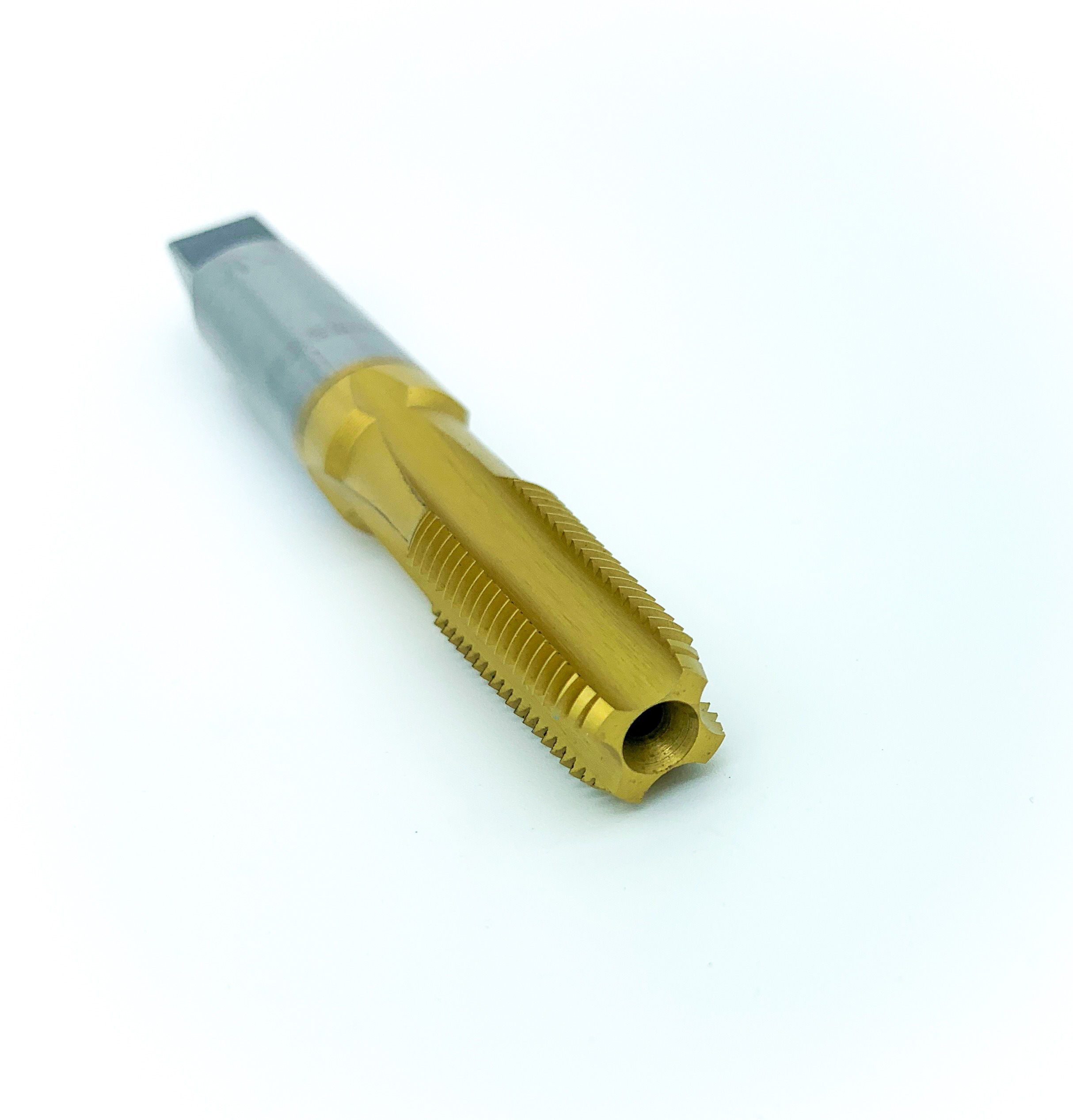 Gold-colored metal drill tap with spiral flutes for cutting internal screw threads.