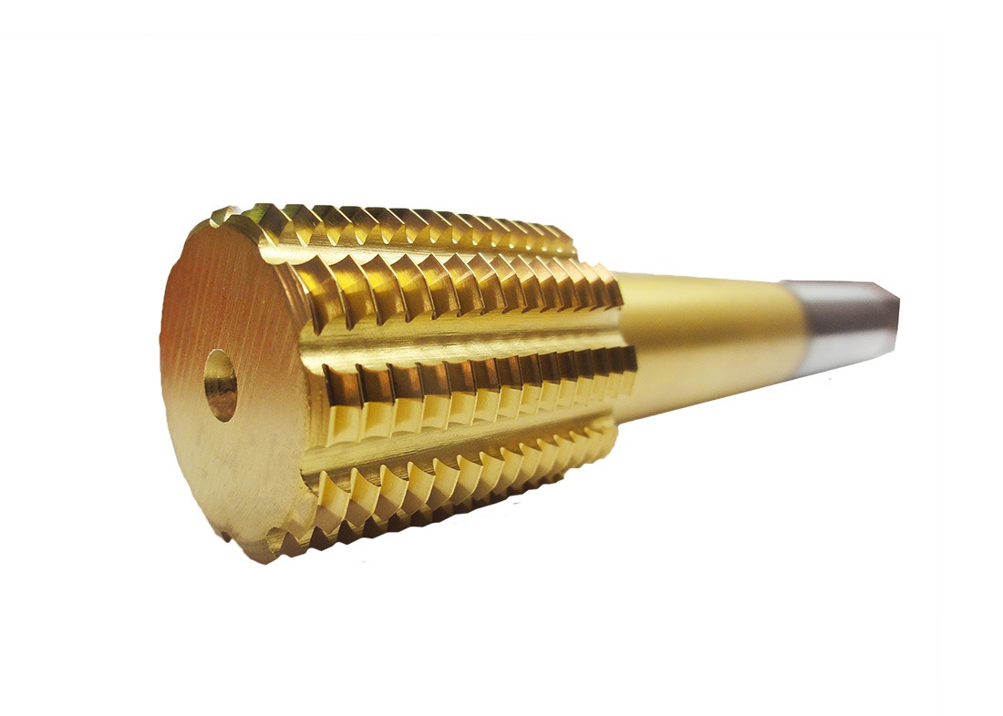 Gold-colored roughing end mill cutter with a cylindrical shank against a white background.
