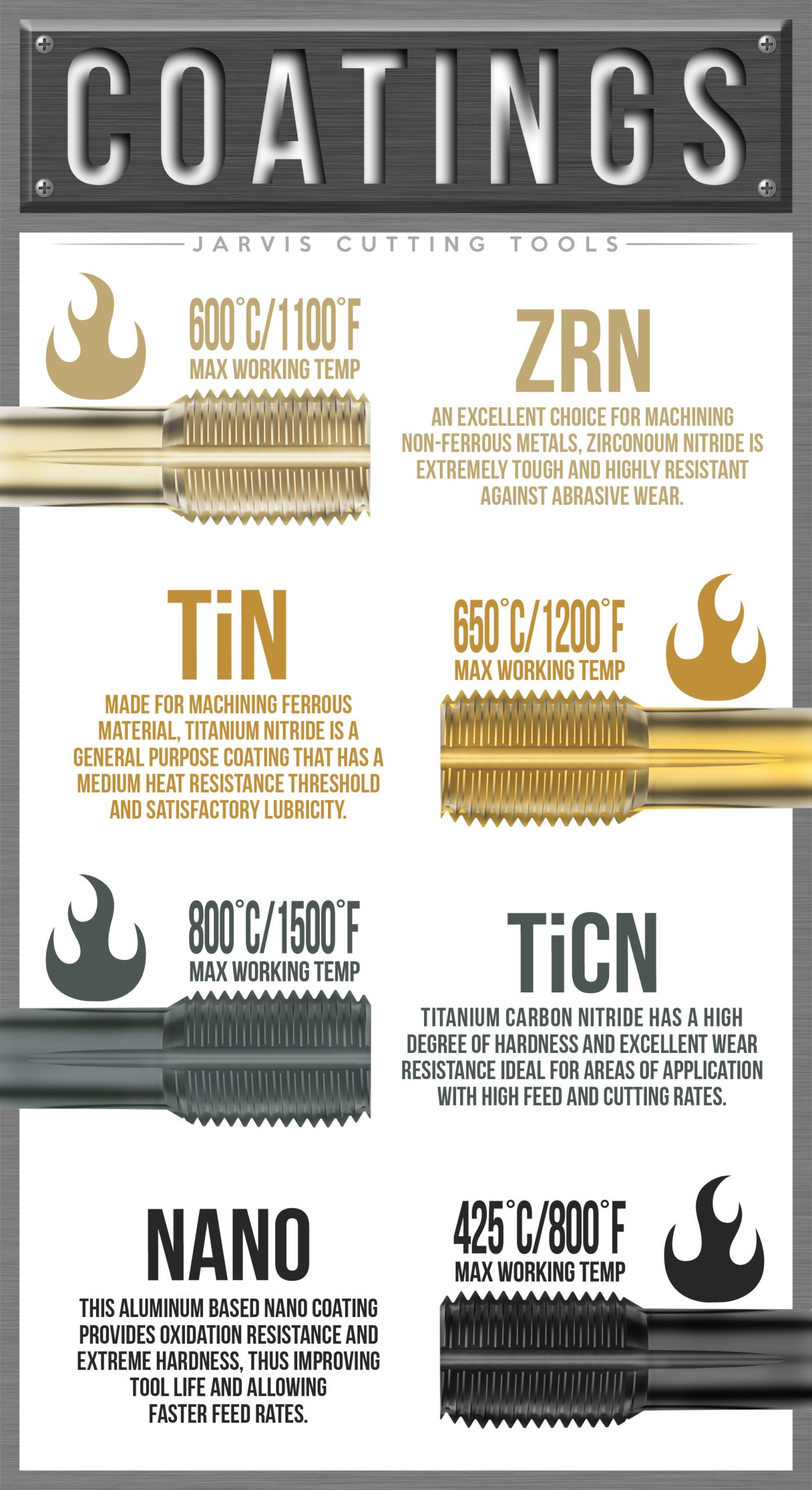 Enhance your tapping performance with Jarvis’ comprehensive range of advanced features and configurations. From premium coating options and optimized base materials to precision geometry, heat treatment processes, and coolant-through solutions.